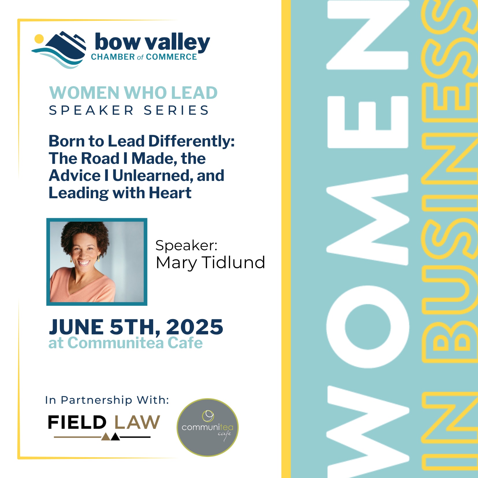 Bow Valley Chamber: Women in Business Speaker Series in partnership with BVCC and Field Law are hosting our first Women in Business Women Who Lead Speaker Series. This is part of an ongoing series Of BVCC Women in Business events offered 2-3 times each year, events open to all who who believe in elevating women in business.